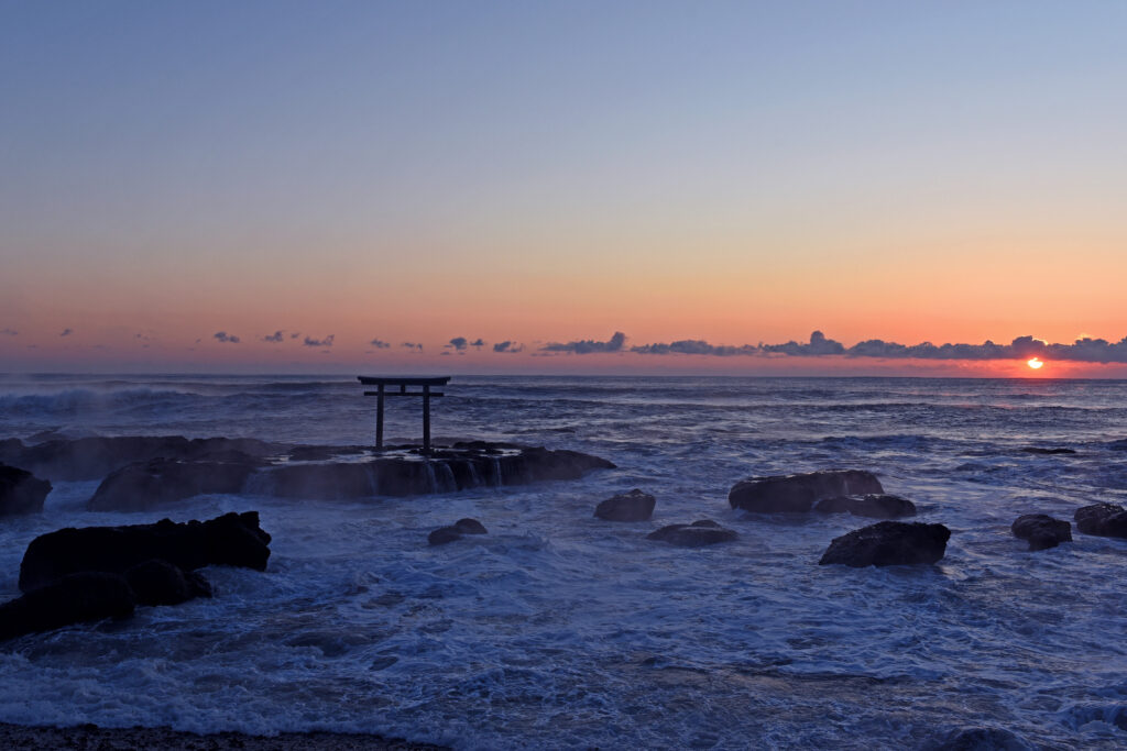 神磯鳥居の真上から昇る日の出の光景は、海岸が真東を向いているからこそ見られるものです。地形と風景は、深いところでつながっています。
