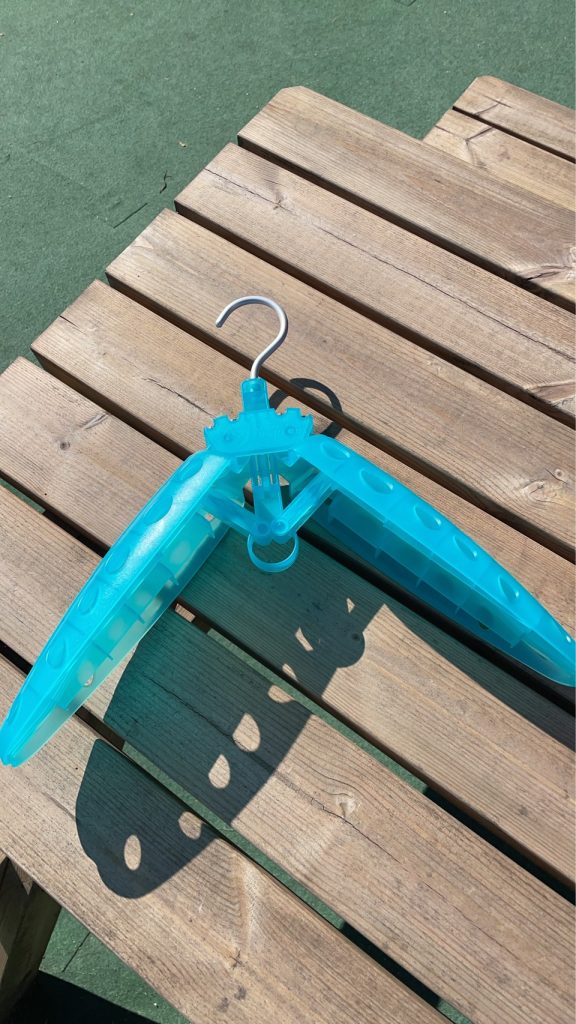 お腹の部分にタオルを挟んで2つ折りにし、ポールなどに掛けるか、